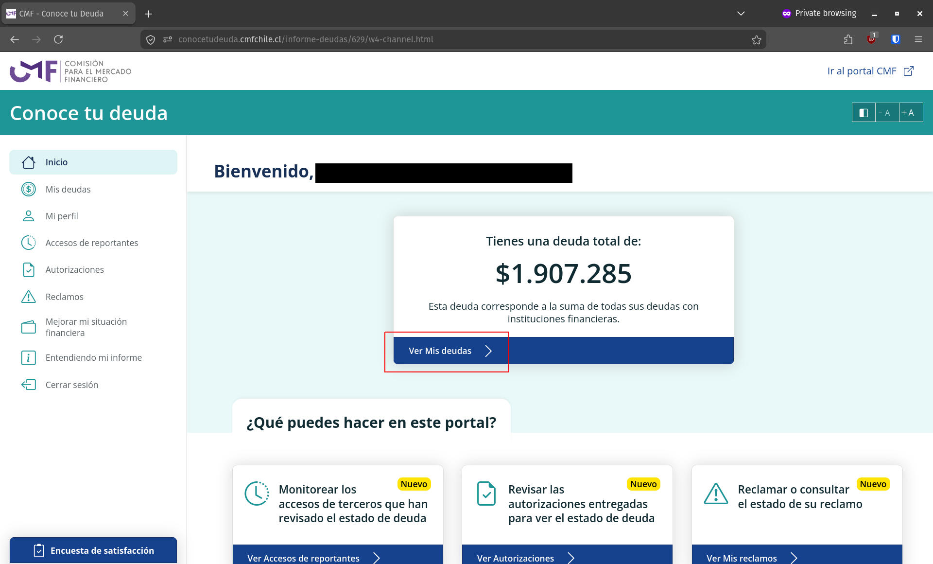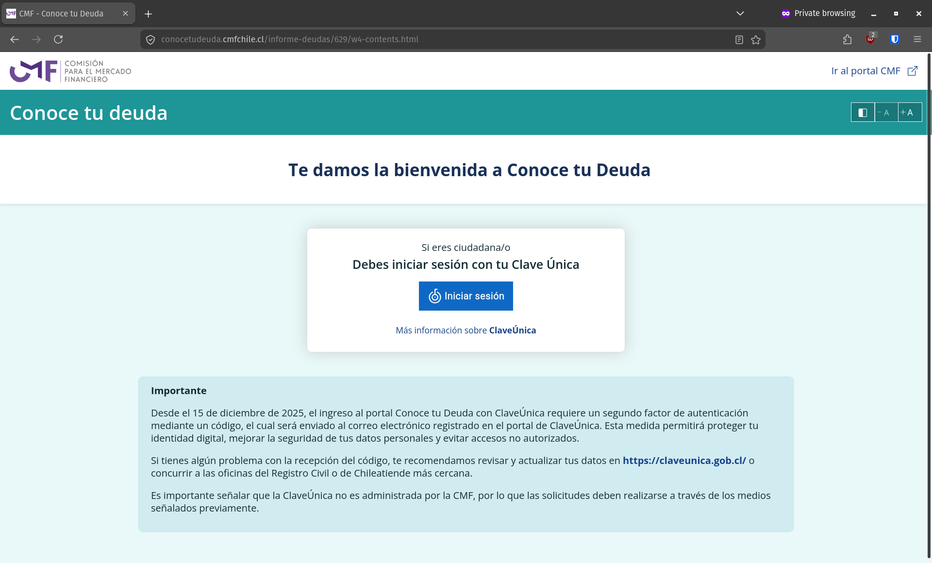 - Ingresa a la web de CMF: cmfchile.cl y haz click en la sección "Conoce tu deuda". O bien directamente en este enlace.